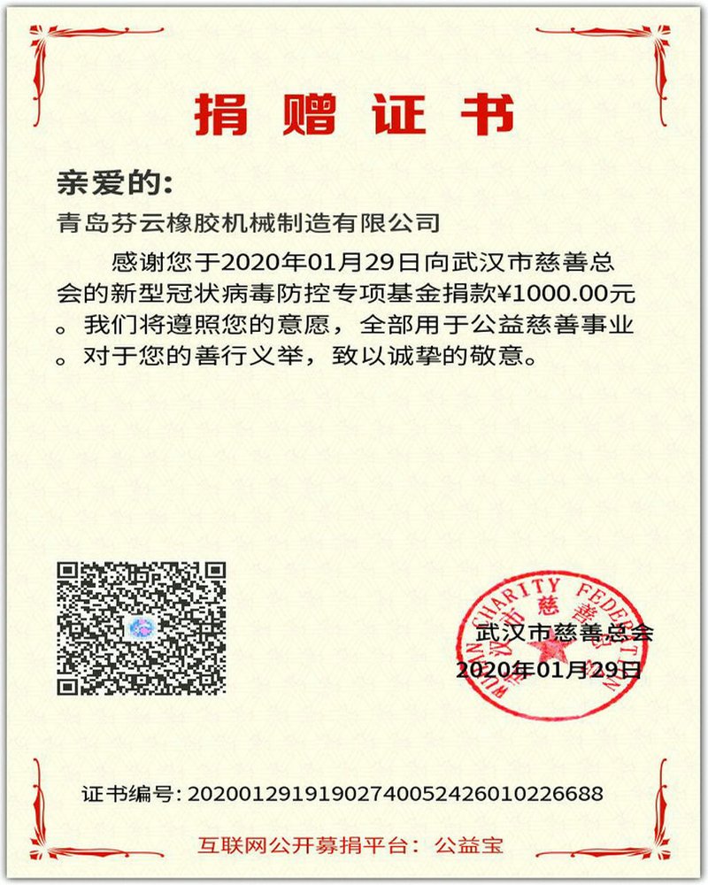 青島芬云橡膠機器制作無限公司為故國抗擊疫情而盡力